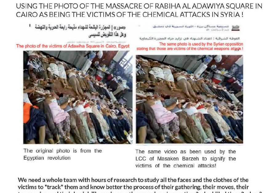 In the image taken from the report, it shows a specific instance where a photo used by the CIA backed rebels claiming to be victims of the chemical attack is in fact the original photo of victims in the Adawiha Square in Cario, Egypt.