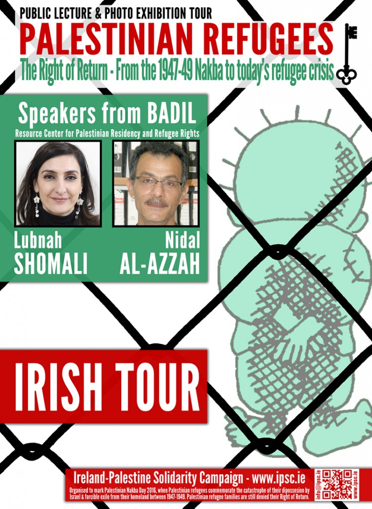 ![]() To mark Nakba Day 2016 the Ireland-Palestine Solidarity Campaign is honoured to present a speaking tour with Lubna Shomali and Nidal Al-Azzah from BADIL, Resource Center for Palestinian Residency and Refugee Rights. To mark Nakba Day 2016 the Ireland-Palestine Solidarity Campaign is honoured to present a speaking tour with Lubna Shomali and Nidal Al-Azzah from BADIL, Resource Center for Palestinian Residency and Refugee Rights. They will tour Ireland from Monday 9th to Saturday 14th May.