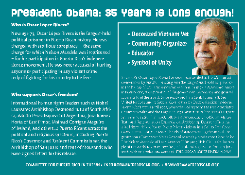 We invite you, in support of the release of political prisoner Oscar López Rivera, to contact the countries of the world which, as members of the United Nations, defend human rights and self-determination of the people, as well as the fundamental statutes of the United Nations. Our purpose is that peaceful activities be carried out in 35 countries (one for each year of Oscar’s imprisonment) in an exercise of freedom of expression and demand for redress before United States entities. This will make known the international support for Oscar’s release. We extend our gratitude for your efforts in order that this clear expression of human solidarity with political prisoner Oscar Rivera be heard loud and clear throughout the world.