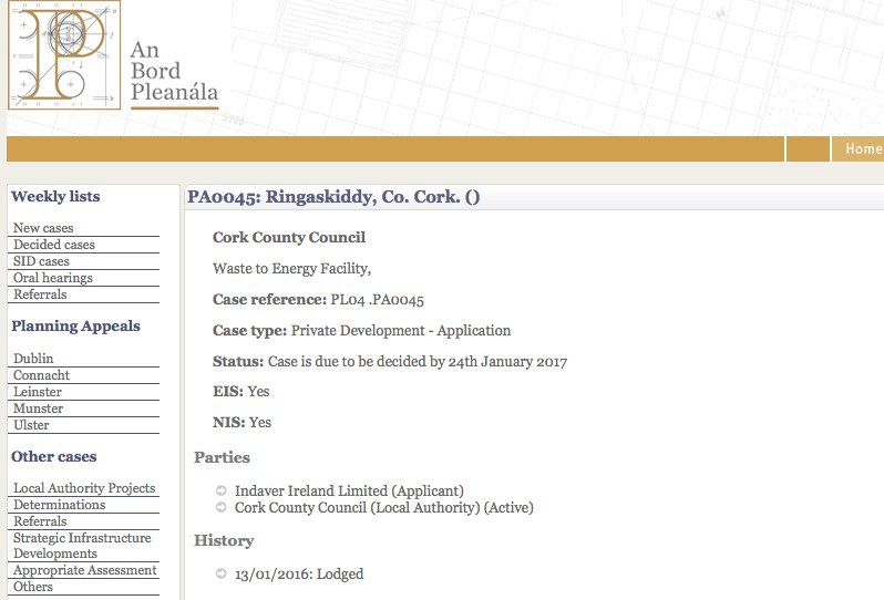 A decision by An Bord Pleanala on the planning application by Indaver Ireland to build a 240,000 tonne hazardous and municipal waste incinerator at Ringaskiddy Co Cork has been extended again with the case now scheduled for a decision by 24 January 2017.