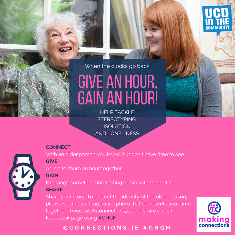 To take part in ‘Give an Hour, Gain an Hour’ they are encouraging everyone to follow four simple steps. Connect with an older person in your life - Share an hour of your time with them – Exchange something interesting or fun with each other – Share your story on social media on twitter @connections_ie or with the Facebook page MakingConnections.ie using #GHGH.