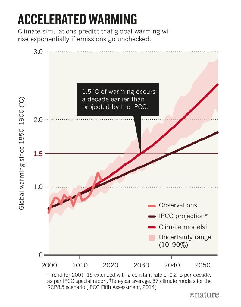 But the latest IPCC special report underplays another alarming fact: global warming is accelerating. Three trends — rising emissions, declining air pollution and natural climate cycles — will combine over the next 20 years to make climate change faster and more furious than anticipated. In our view, there’s a good chance that we could breach the 1.5 °C level by 2030, not by 2040 as projected in the special report (see ‘Accelerated warming’). The climate-modelling community has not grappled enough with the rapid changes that policymakers care most about, preferring to focus on longer-term trends and equilibria.