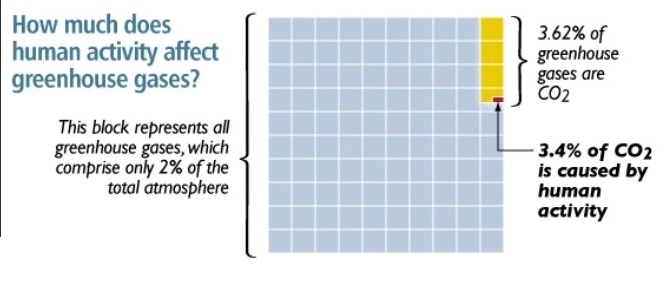 amounts to 0.04% of the atmosphere (400ppm), of which a mere 3.4% is as a result of all human activity.