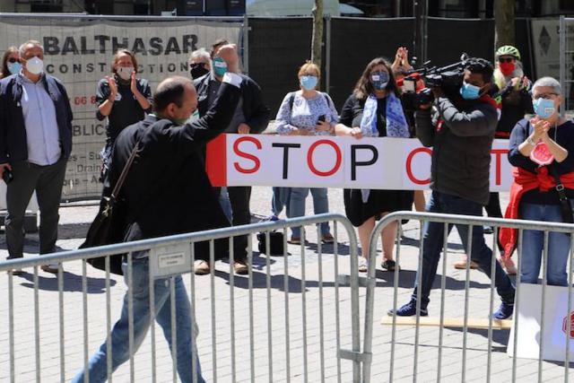 Anti Ceta protestors applaud Déi Lénk parliamentarian Marc Baum outside the Cercle Municipal on Wednesday afternoon. Photo: Chamber of Deputies via Twitter