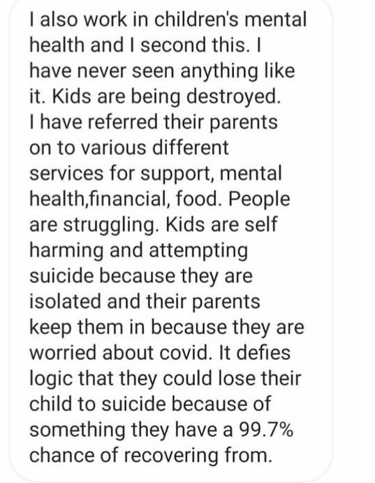 I am a teacher. Child abuse plain and simple. I am leaving; too haunted by what we are doing to the kids. I tell my classes they can all take their masks off in the classroom. This brainwashing is exactly how it was in the Third Reich. Incredible to be witnessing it.