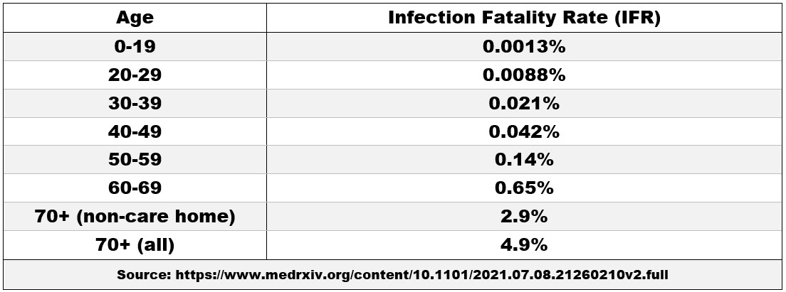 Prof. Ioannidis has now published an update, using additional seroprevalence studies, though still based on 2020 data, as “IFRs in 2021 may be further affected by wide implementation of vaccinations that may substantially decrease fatality risk and by other changes (new variants and better treatment)”. The new study has a special focus on the IFR in the elderly, but also includes estimates for all age groups, though not a new overall estimate.