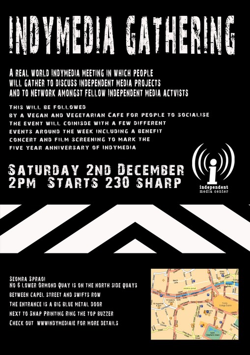 As a member of the Indymedia Ireland Internet Collective, I'd be interested in going along although I'll be very busy over the weekend. Knowing what the agenda is would help me come to a decision or to decide which session I should plan to go to. Regardless, it's good to see a real world collective start to take shape and I hope the meeting goes well.