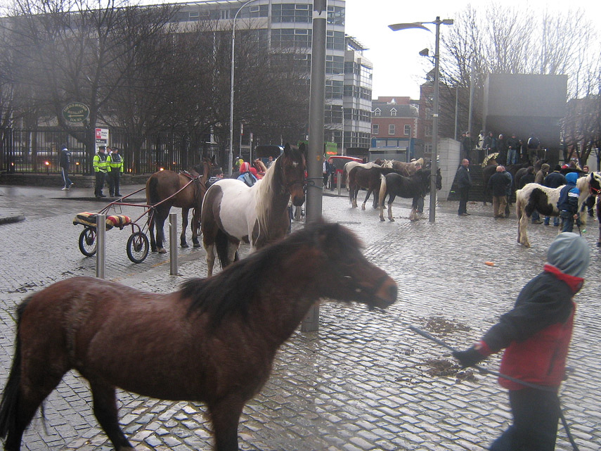 Another way of looking at is that Smithfield is where a lot of soon-to-be abandoned horses find new homes. During the boom years horse-ownership , jodpurs and riding lessons for the kids became important status symbols for a lot of high earners in this country . With the onset of the recession many horse-owning middle class households found themselves unable to pay high stabling costs and started dumping their horses .The luckier ones ended up at Smithfield .