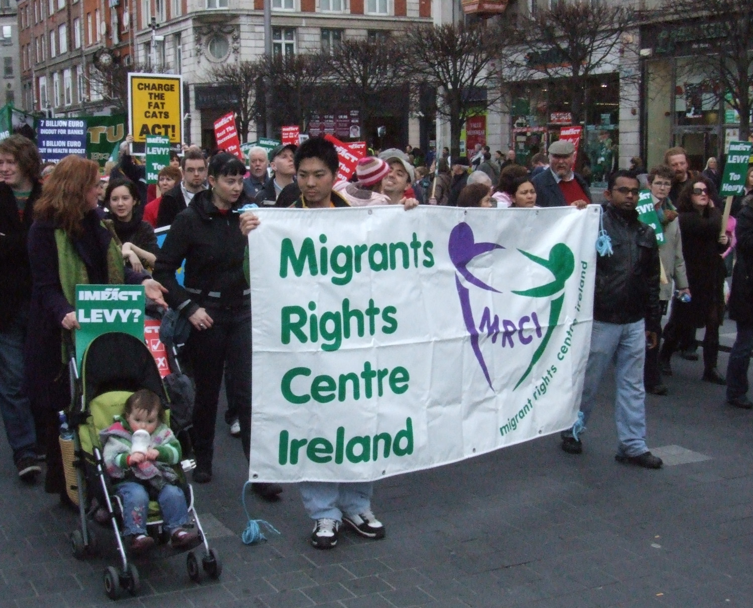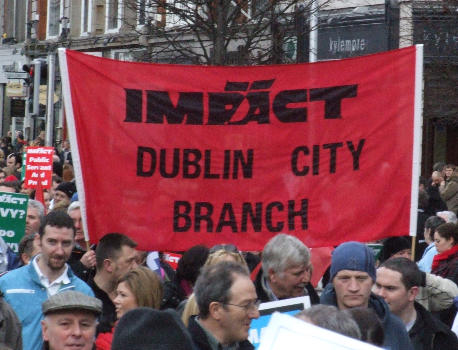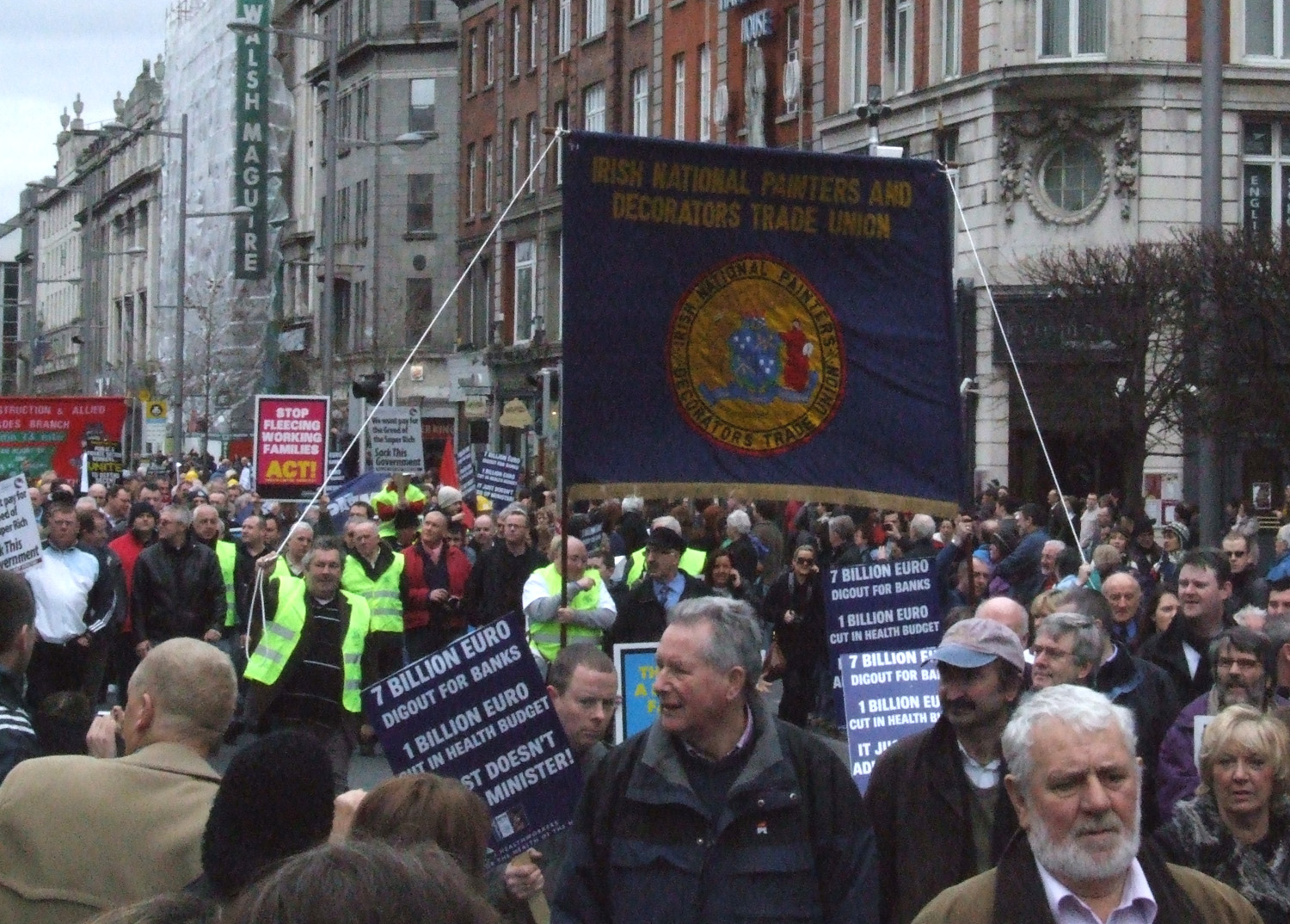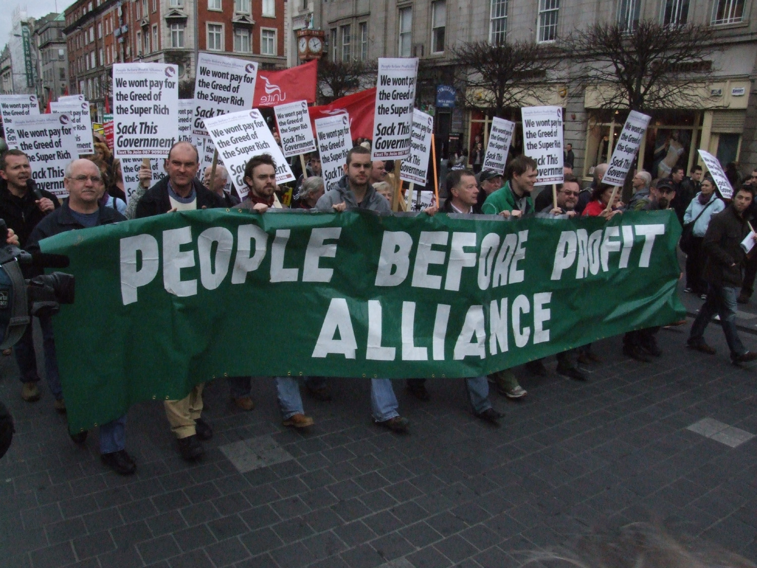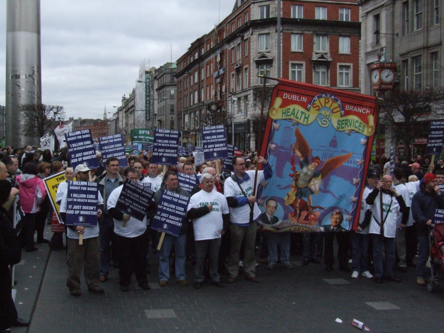 Like many others who attended the march on Saturday 21st February I was surprised at the massive turn out. At 13.50 I was walking up O’Connell street and the march was passing the GPO. I walked around the march, curious to see how it was arranged, and what groups were represented. Eventually, I trickled down to the back of the march which passed the GPO at around 3.30pm. There were at least 120,000 protesters on the march. Some estimate slightly more, some slightly less. ICTU claim it was the biggest march in thirty years at 150,000+ , whilst RTE claim less than 100,000. But, overall I think 120,000 is a fair estimate. Either way there can be no disputing the fact that this was a huge turnout.