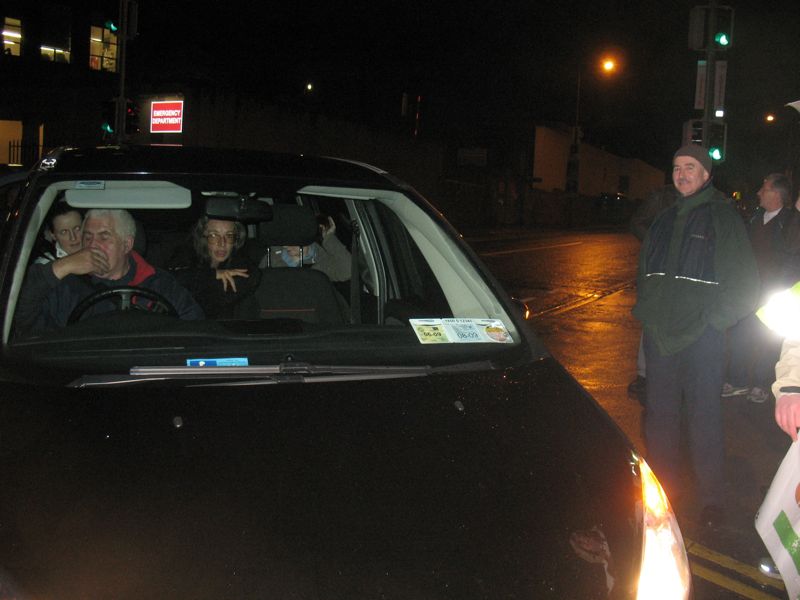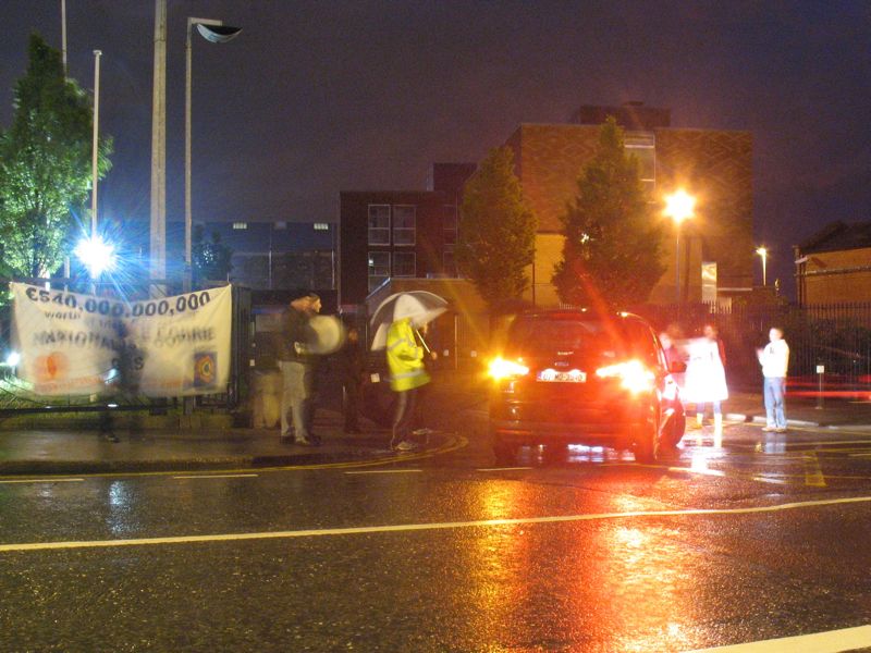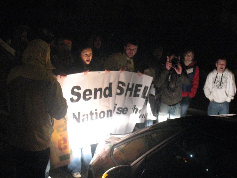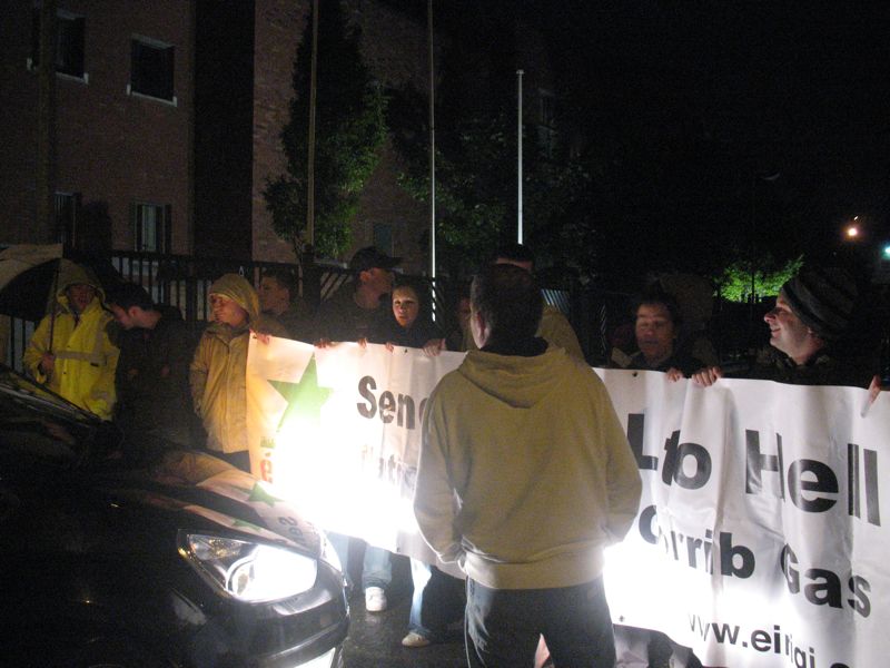 It was great to see such a committed group turning out on such a miserable evening and at such short notice. I was there - the atmosphere was great. A passing-by woman of between 60 and 70 stopped for a moment and told two of us she was from near Rossport. She said, the people around there fought for their land in the time of Michael Davitt and the Land League and their rights to the land are being taken away again. The chant ran "Whose cops? Shell's cops", sad but true. Jinx Lennon played at the gig last night organised by AFrI (w Christy Moore and many others) - he has written a song about it called the Conquistadors of Mayo, it is bleedin brilliant!