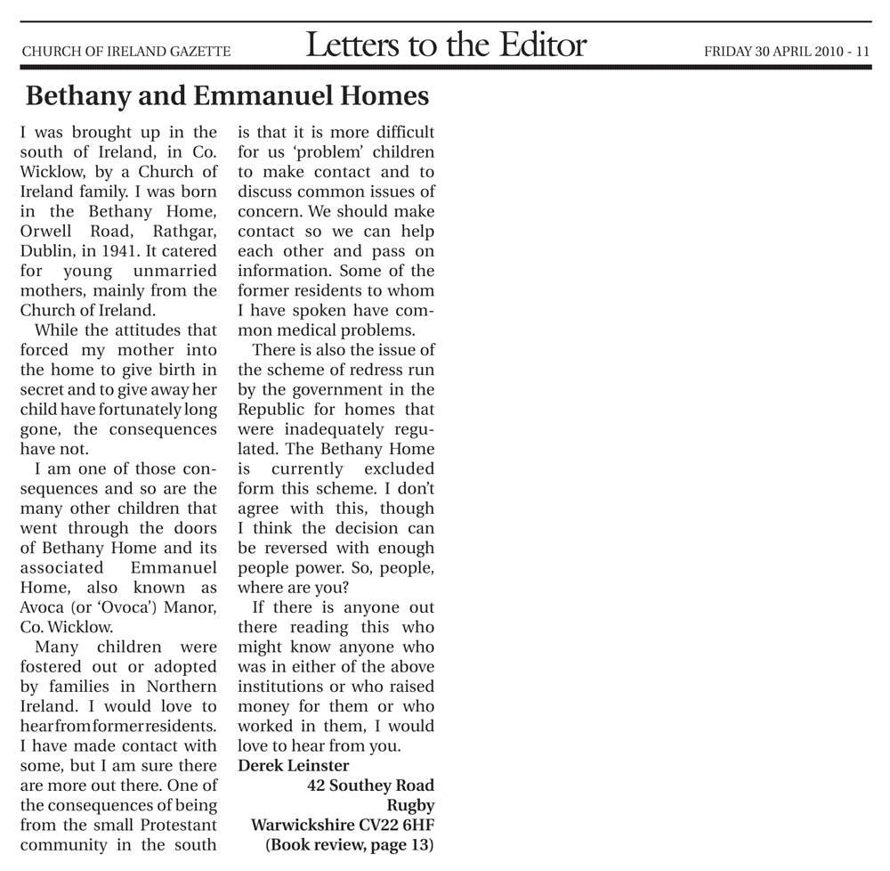 Derek Leinster - letter in Church of Ireland Gazette May 2010