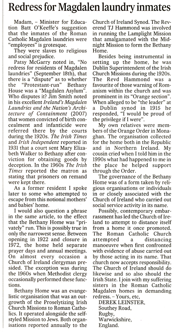 I am grateful to Justice for Magdalenes (JFM) for raising the Bethany Home with Government ministers and their officials, as part of the campaign for redress for survivors of the Magdalene homes. I am disheartened to note, however, from Prof Smith’s letter that JFM is now also being ignored.