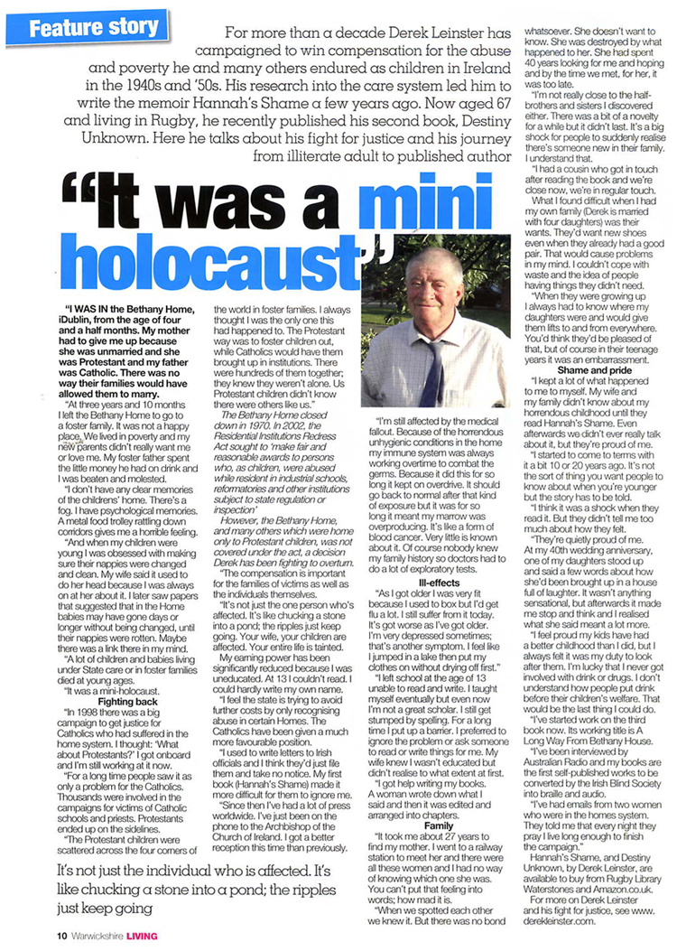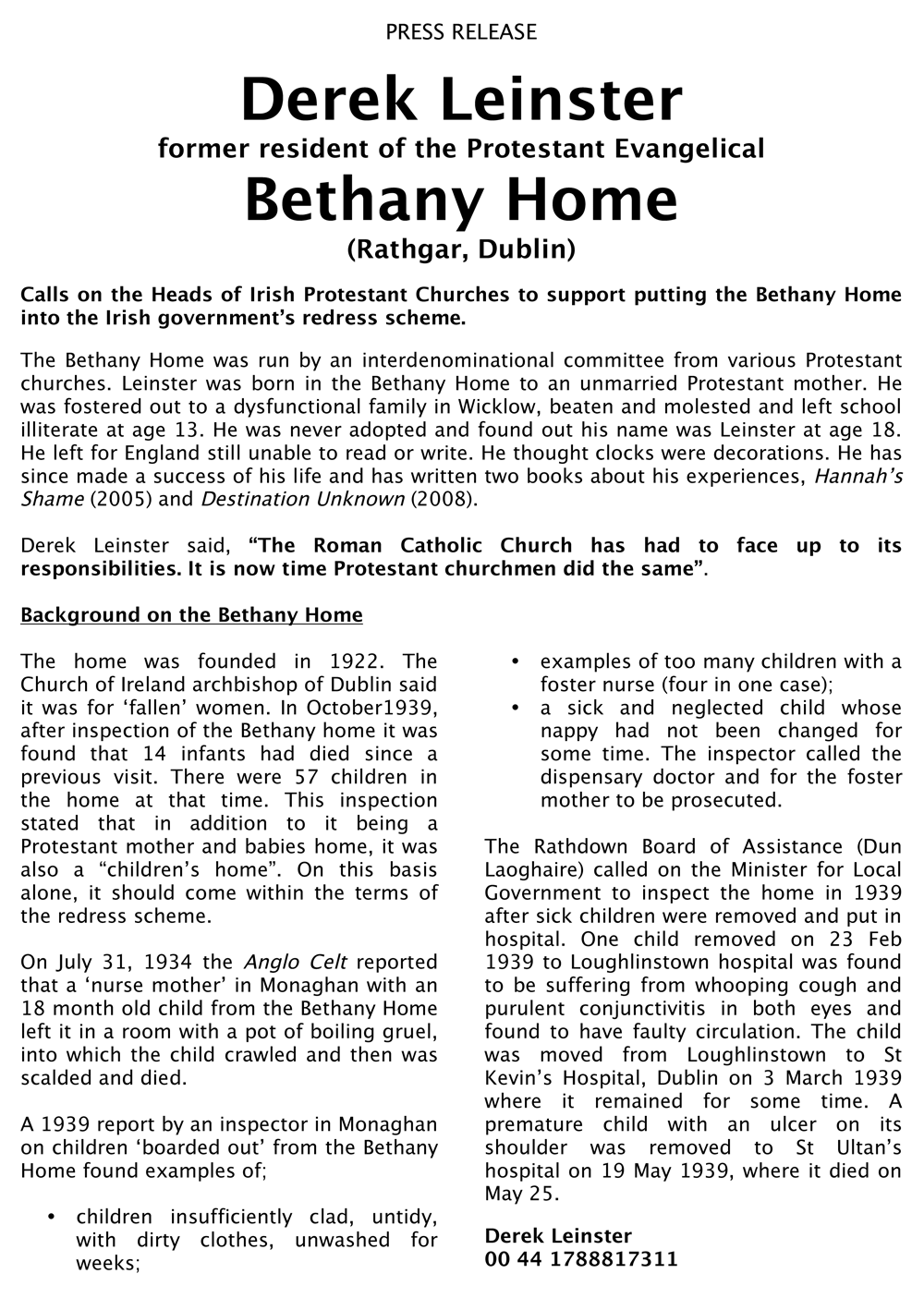 The Bethany Home was run by an interdenominational committee from various Protestant churches. Leinster was born in the Bethany Home to an unmarried Protestant mother in 1941. He was fostered out to a dysfunctional family in Wicklow, beaten and molested and left school illiterate at age 13. He was never adopted and found out his name was Leinster at age 18. He left for England still unable to read or write. He thought clocks were decorations. He has since made a success of his life and has written two books about his experiences, Hannah’s Shame (2005) and Destination Unknown (2008).