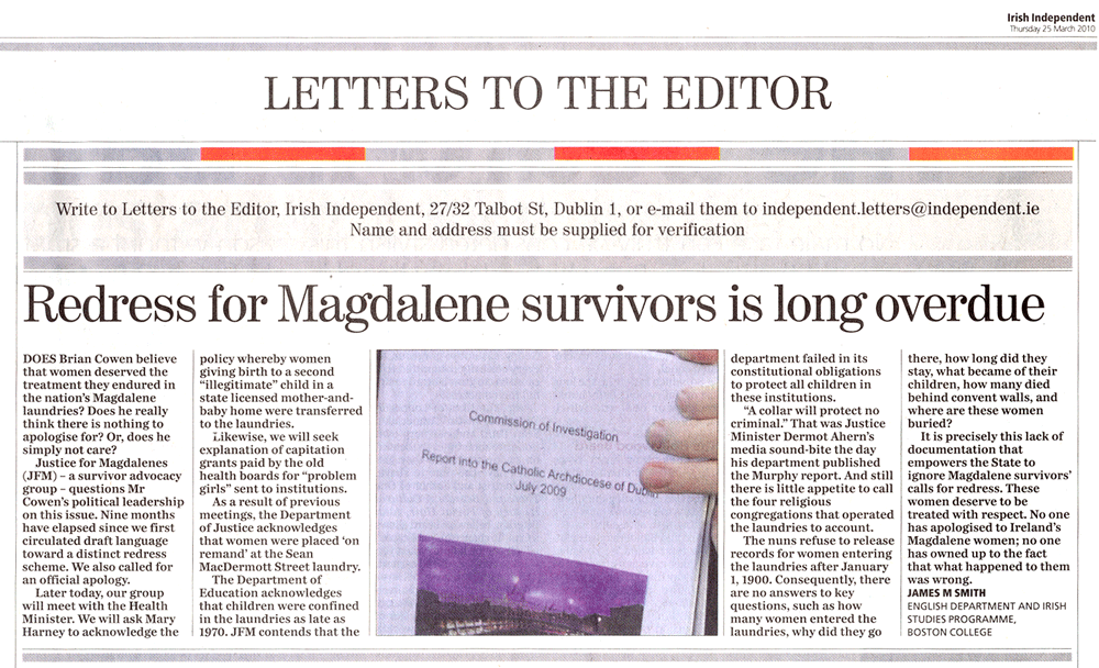 Justice for Magdalenes - lead letter Irish Independent 25 march 2010