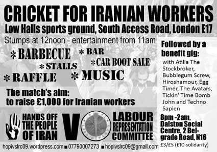 On Saturday August 1, Hands Off the People of Iran will be playing a fundraising cricket match against the Labour Representation Committee. The team captains, John McDonnell MP (LRC) and Attila the Stockbroker (HOPI), will be tossing a coin at 11 am, and the first ball will be bowled at noon. Even the weather should not be able to get in our way, as we will have numerous gazebos with a fully-stocked bar and food.