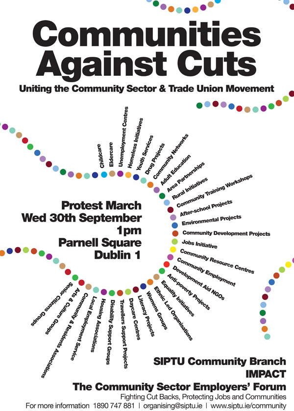 There has been a great response to the Wednesday 30th September protest with dozens of organisations support the campaign. These include ICTU, SIPTU, IMPACT, UNITE, Dublin Council of Trade Unions; the Community Sector Employers Forum, PLANET, the Community Platform, the Community Workers Co-Op, Pavee Point, CDP’s, Community Employment, Citywide Drug Crisis Campaign, National Women’s Council... to name but a few.