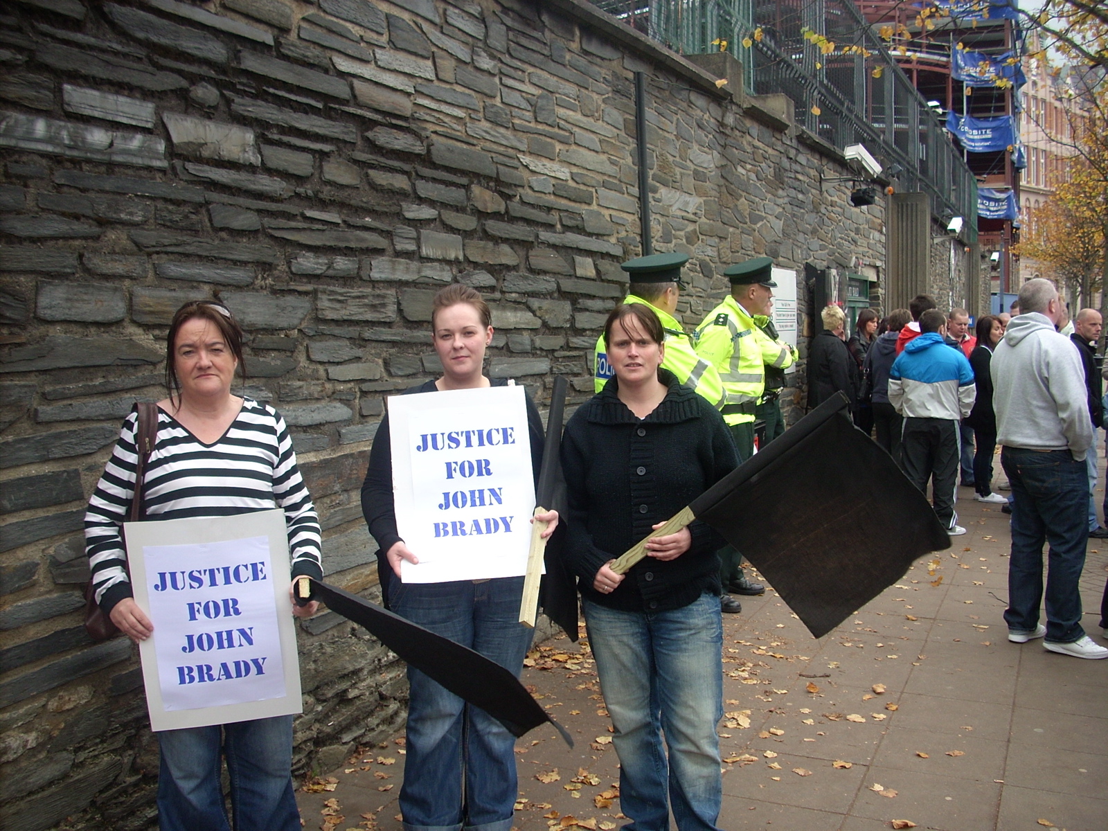 "Man dies in police custody" - No matter what the circumstances of John Brady's death are, this is the only fact we know and it ought to be enough to mobilise everyone who claims the mantle of human rights, of social justice, of the civil rights movement and of republican ideals, whatever their faction, civil libertarians and even liberals, to demand that a spotlight be shone on all the circumstances of his death. It was therefore shocking, although not surprising, to find no senior republicans of the mainstream kind at all at the protest outside Strand Road barracks last Monday. There were no hoards of right-thinking academics either, nor of human rightsies. Instead I joined the handful of lefties resigned to weathering the accusations of being fellow-travelers to the dissidents and a crowd of 200 odd protesters some mobilised by the various "dissident" groupings as well as the IRSM, a good crowd, given the political climate.