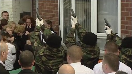 One man shouted orders in Irish and three fired shots into the air over the coffin which was draped in a tricolour with a black beret and gloves on top.