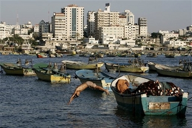 - Image - A Palestinian youth dives into the sea from a fishing boat at the port of Gaza City, in the Gaza Strip, Saturday June 23, 2007 (AP)