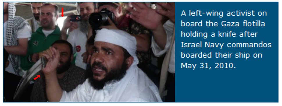 The IDF apparently told Haaretz that the photo was taken immediately after its Naval commandos raided the Mavi Marmara and other flotilla ships — at least, that’s how Haaretz described the photo based on an IDF source. Yet the raid was conducted under the cover of darkness. How could a photo obviously taken during daytime have portrayed an event that took place during the late evening? Do Muslims have magical powers that allow them to turn night into day? And why were reporters standing around, casually taking photos when commandos were supposedly getting “lynched?” Once again, the IDF’s story was highly suspect.