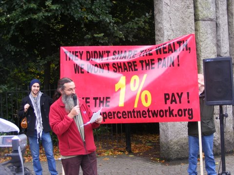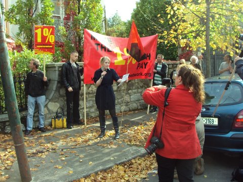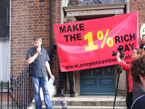 At about 1.30pm the first speaker of the day, Gregor Kerr, took to the microphone to outline the background to both the 1% Network and the purpose of the tour. Kerr said.....”Listening to the vast majority of media comment on the financial crisis, you’d be forgiven for thinking that there are no wealthy people left in Ireland. But the reality is that they do still exist and the wealthy today are the same as the wealthy of a few years ago…….The wealthiest earners in Ireland do not pay their way, and do not pay their share. The rest of the population then ends up in an endless debate about where the cuts should come - should they be taken from the education or the health budget, should income tax be increased for low earners, should the wages of public servants be cut......But while we engage in that discussion we're missing the bigger picture. We're arguing about dividing up the crumbs while the big slice of cake is left untouched on the table. Today’s tour is about trying to focus attention on the whole cake.”