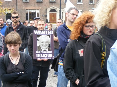 The tour was reminded that the Shelbourne Hotel, directly beside the assembly point of the tour, was the venue for an infamous dinner in 2008, when 13 businessmen paid €65,000 to dine with Brian Cowen. Amongst those unlucky diners was Brian O’Farrell, one of the ten strong ‘Anglo Golden Circle’, who described the dinner as being ‘just like a normal chat.’