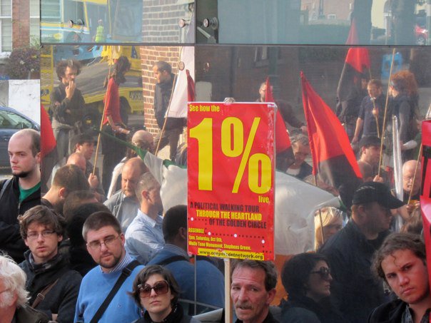 Up to 250 people took part in the 1% Network’s walking tour on Saturday last, October 9th. As people began to gather from as early as 12.30pm it was clear that large numbers were going to to take the opportunity to ‘see how the 1% live.’ The unusually warm weather and low-key Garda presence added to the almost festive atmosphere for this most unusual of political protests.
