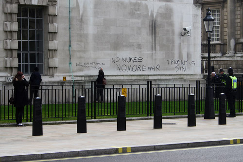 We were eventually joined by over a hundred others for a liturgy organised by Pax Christi, Christian Campaign for Nuclear Disarmament (CCND) and the Catholic Worker, welcoming of participation by people of other faiths and no faith traditions, the broader range of nationalities was enhanced with a demographic favouring older folks. The Buddhist nun and monk of Nipponzon Myohoji were present reminding us of the legacy of Hioshima and Nagasaki. Also present were Plowshares activists who had disarmed nuclear weapons systems and people who had worked and lived in war zones from Africa to Palestine to East Timor to the north of Ireland to the Philippines.
