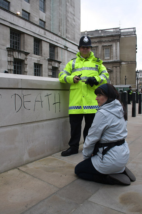 The party of over a hundred stopped on two occasions to continue the liturgy before crossing the road. Henrietta, Fr. Martin and Scott remained on their knees as the police questioned them taking details. As the main party arrived at the man entrance to the building, Sr. Susan Clarkson of St. Francis Catholic Worker House Oxford and Maria Albrecht of the Catholic Worker Farmhouse dropped to their knees and wrote on the M.O.D. building......