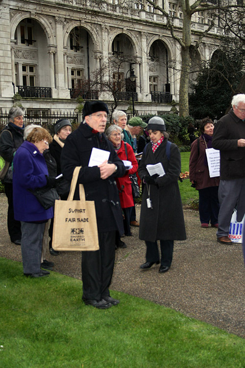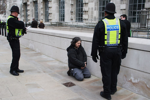 We passed McDonalds, Royal Bank of Scotland, New Scotland Yard, the QE2 Conference Centre, British Parliament before arriving at Downing St. to support a small "Campaign Against the Arms Trade" (CAAT) delegation delivering a petition to British Prime Minister Cameron regarding British arms exports to the Libyan dictator Gadaffi. These British arms are presently being turned by Gadaffi on his own people.