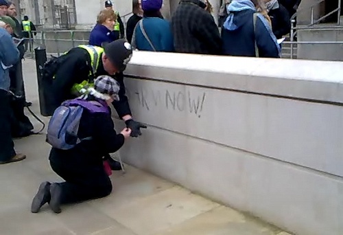 crossed the road from the main party dropped to his knees and wrote on the M.O.D. building........