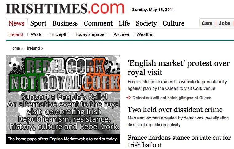 In todays online Irish Times, the "Ireland" section leads with its main image that from the Cork rebels who are opposed to the royal visit that is coming to the "English market" http://www.irishtimes.com/ireland/