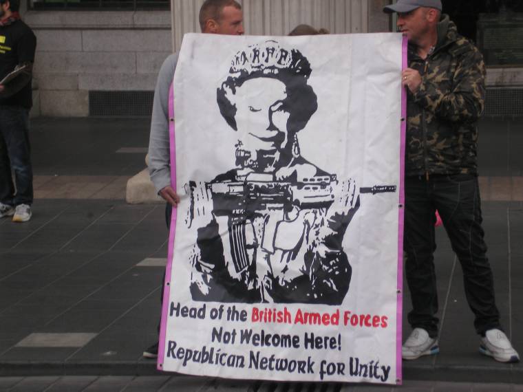 The Republican Network for Unity will be protesting against this unjustifiable visit on the 17th of May and we encourage all republicans to gather at Connolly Train Station at 12pm where we will then march to the Garden of Remembrance."