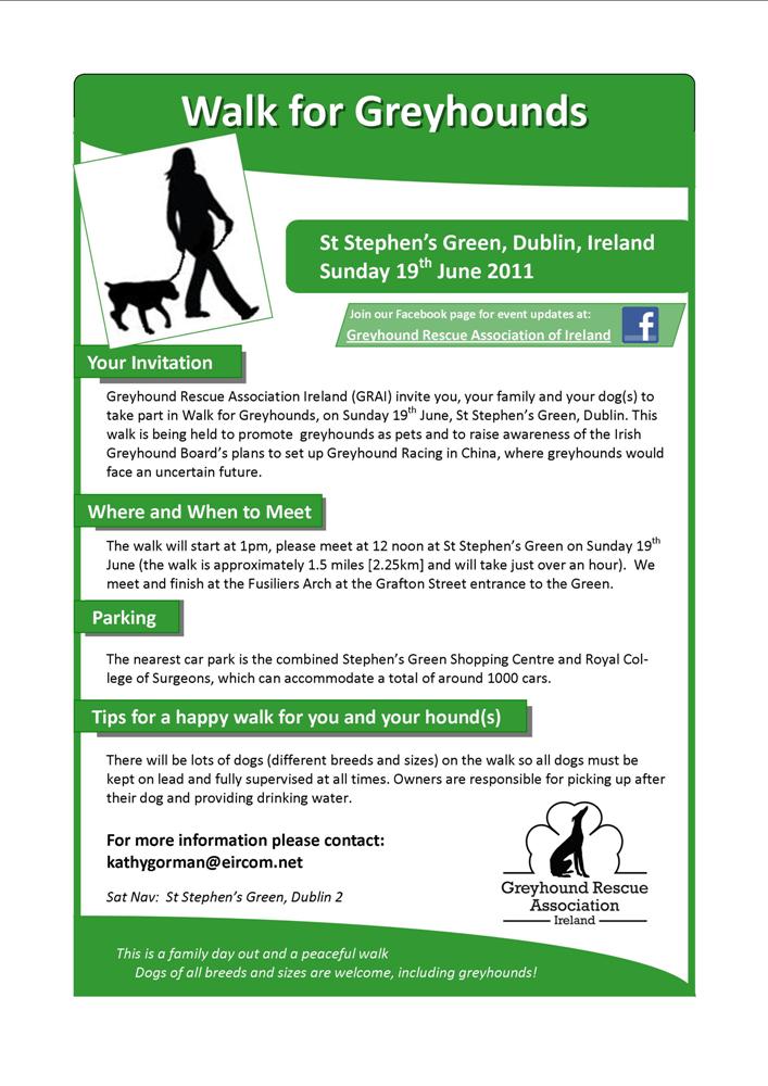 The Walk has been organised by the Greyhound Rescue Association of Ireland (GRAI). GRAI, is made up of thirteen Irish charities involved in rescuing and re-homing former racing greyhounds.
